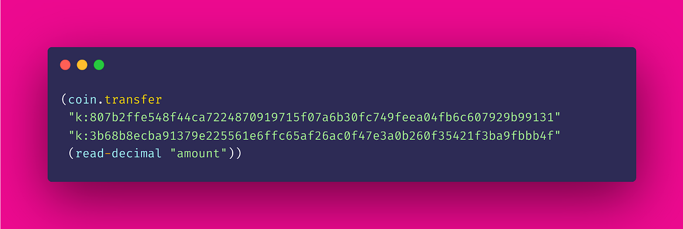 Above code is one example of writing the KDA transfer function with read-decimal, where amount is passed into data field as a string. This way, amount is always read as decimals, and the type error shown in example 1 is prevented.